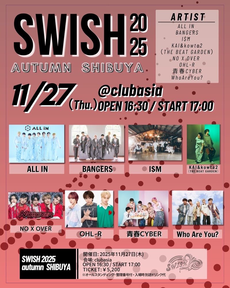 SWISH 2025 autumn SHIBUYA SCHEDULE 2025/11/27(木) SHIBUYA club asia OPEN16:30 / START17:00 ▶︎11/27(木)▶︎SHIBUYA club asia▶︎OPEN16:30 / START17:00▶︎チケット5,200円(+1D) チケットはこちらから URLをコピーする 報告する