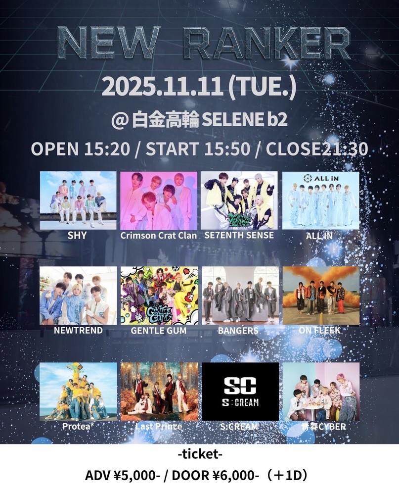 NEW RANKER SCHEDULE 2025/11/11(火) 白金高輪SELENE b2 OPEN 15:20 / START 15:50 ▶︎11/11(火)▶︎白金高輪SELENE b2▶︎OPEN 15:20 / START 15:50▶︎出演 15:50~16:10▶︎物販 並行物販 16:20~17:40▶︎前売り ¥5,000(+1D) / 当日 ¥6,000(+1D) チケットはこちらから URLをコピーする 報告する