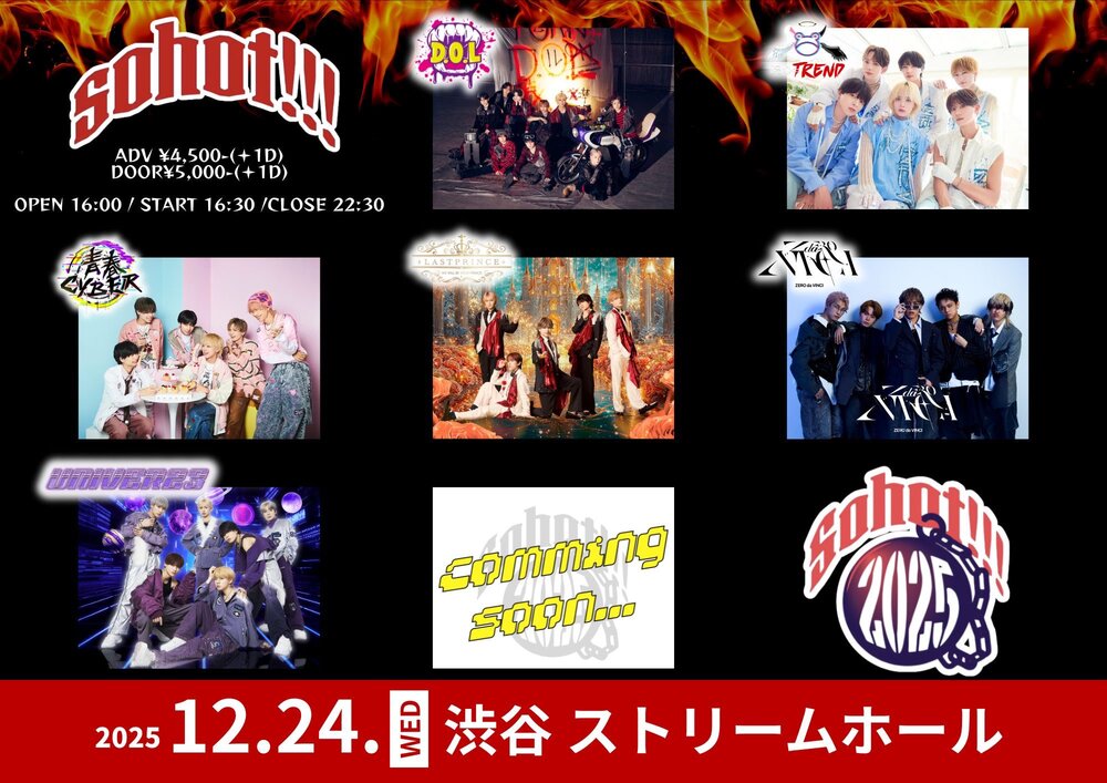 Sohot!!! SCHEDULE 2025/12/24(水) 渋谷ストリームホール open16:00/START16:30/CLOSE22:30 ▶︎12/24(水)▶︎渋谷ストリームホール▶︎OPEN16:00/START16:30/CLOSE22:30▶︎前売り¥4,500/当日¥5,000(1D別) ⚠️タイムテーブルは後日公開 チケットはこちらから URLをコピーする 報告する