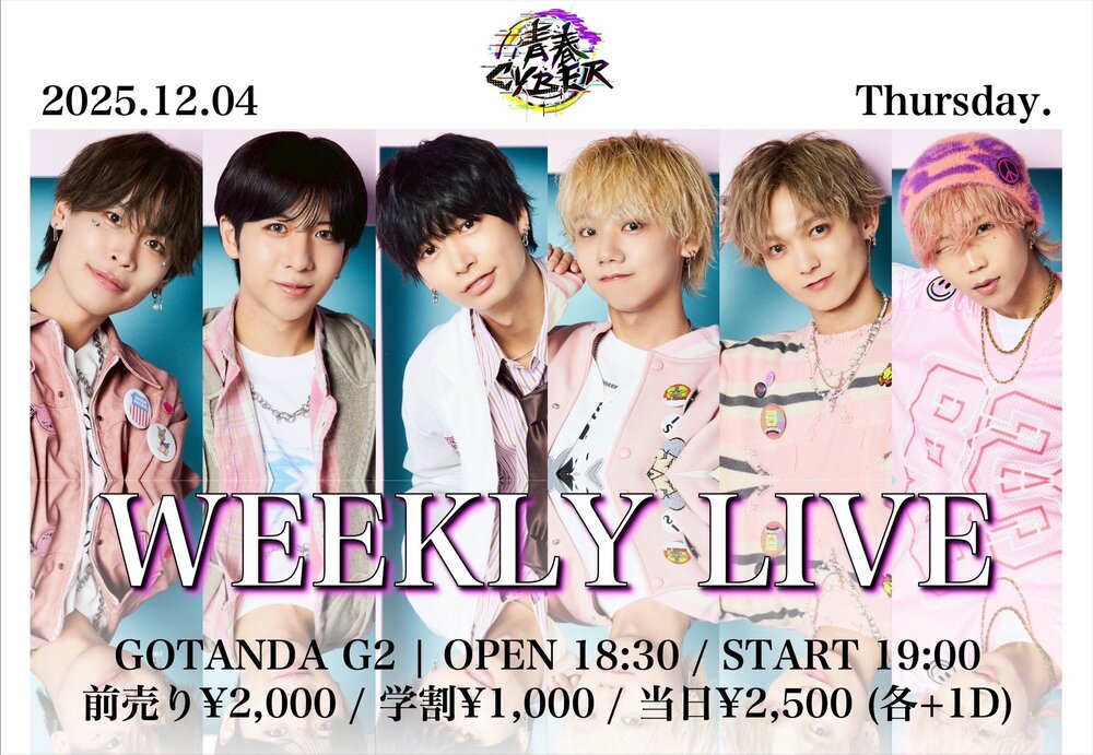 青春CYBER WEEKLY LIVE SCHEDULE 2025/12/04(木) GOTANDA G2 OPEN 18:30 / START 19:00 ▶︎12/4(木)▶︎GOTANDA G2▶︎OPEN 18:30 / START 19:00▶︎前売り¥2,000 / 学割 ¥1,000 / 当日¥2,500 (+1D) チケットはこちらから URLをコピーする 報告する
